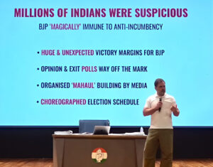 राहुल गांधी ने कहा कि जब बैलेट पेपर से चुनाव होता था, तब पूरा देश एक दिन में वोटिंग करता था। लेकिन अब EVM का सहारा लेकर महीनों तक चुनाव खींचे जाते हैं। उन्होंने पूछा: